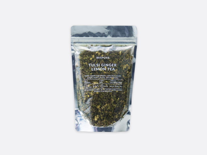 Ingredients: 100% organic ingredients. Tulsi (holy basil) herb, lemon myrtle, ginger and natural flavors 3.5 ounce resealable bag.
