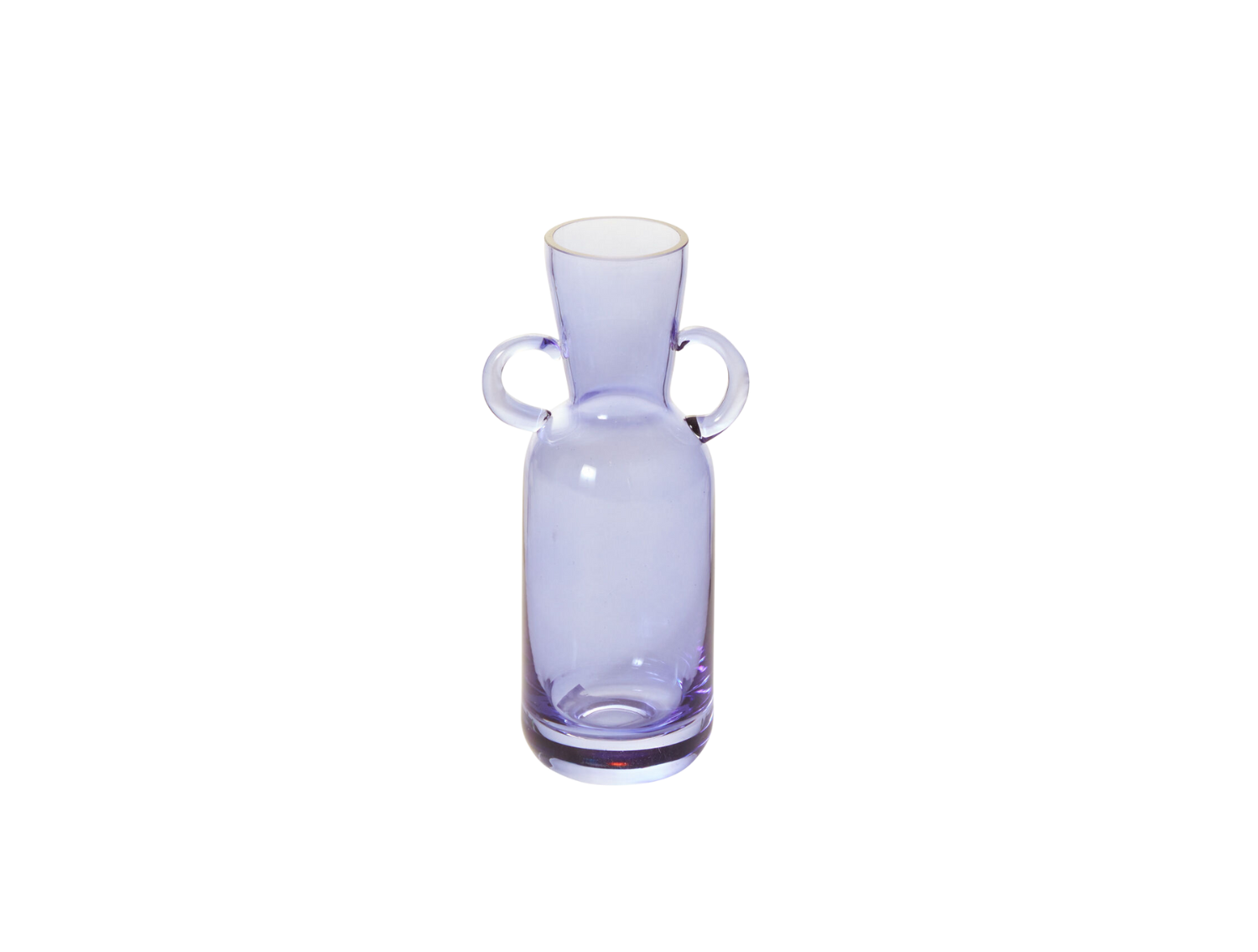 This handmade glass vase features small decorative handles on the neck, a light purple color & a smooth, circular opening.