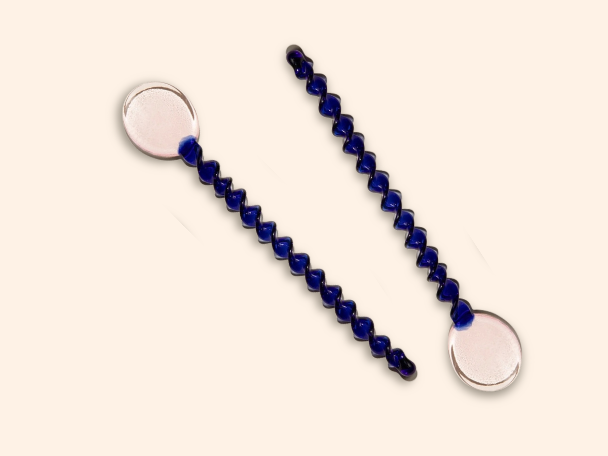 These flat glass stirring spoons are made of flat borosilicate glass. Due to the nature of that material, each spoon comes out a little bit different. They are all similar in size, but with slight bends, curves, or uneven edges that make each spoon unique.