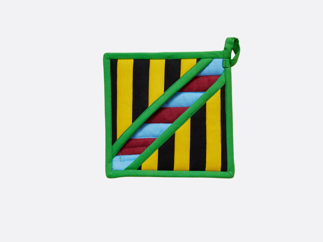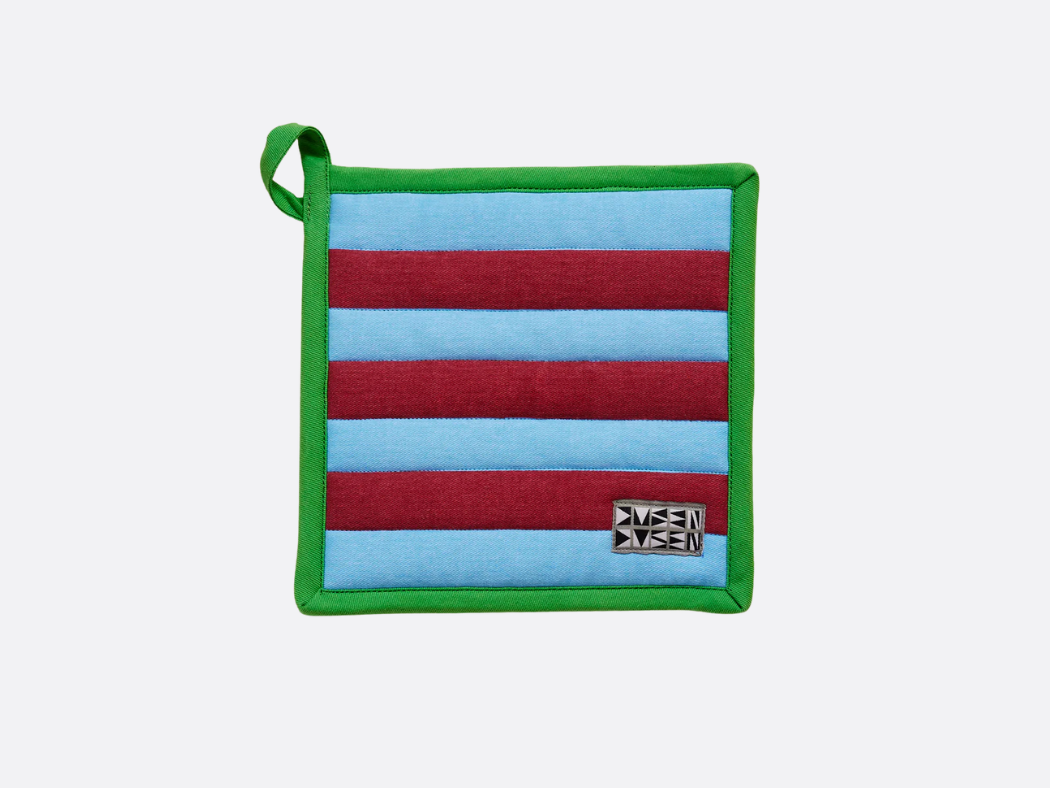 Do not use pot holder when wet. Square shape pot holder featuring two interior pockets, top stitched brand label, and a locker loop for easy hanging.