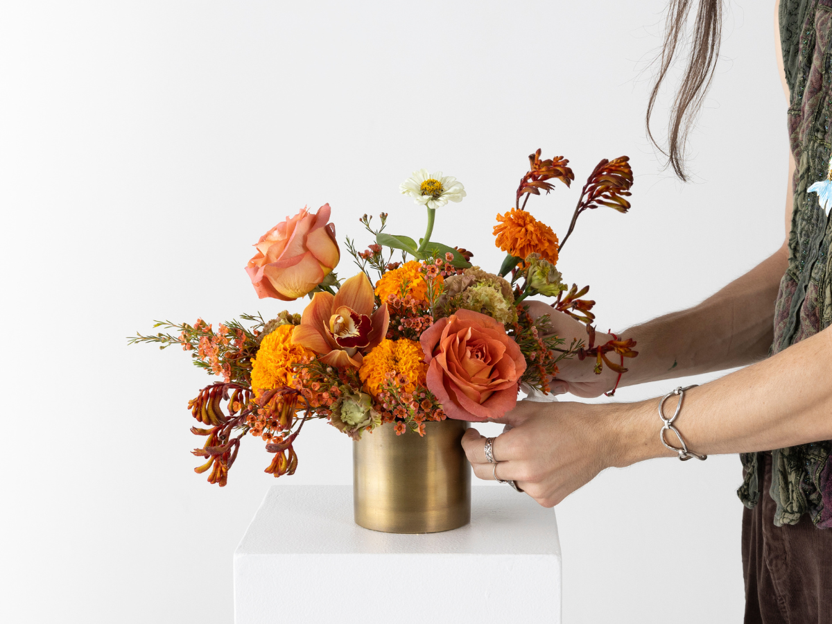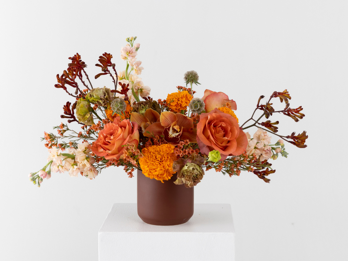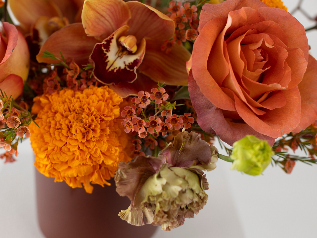 This arrangement will include blooms like roses, lisianthus, marigolds, stellata pods and flowering stock.