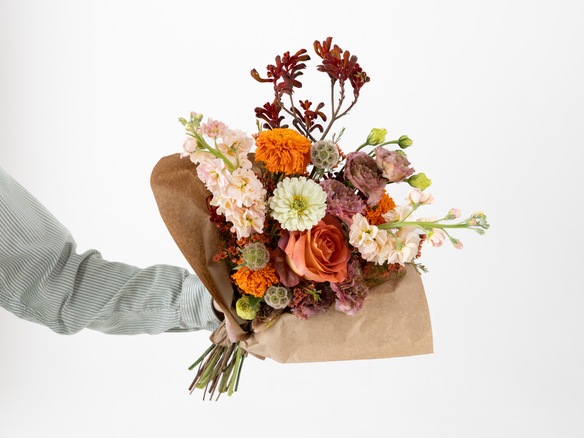 Available in 3 sizes. The Hand-tied option will come wrapped in a compostable water-wrap to ensure freshness and will not come with a vase. The Standard size will come in a brass vase and the Deluxe size will come designed in a terracotta ceramic vase (vase may vary based on availability). "Standard" size is approximately 13" wide by 15" height. **Each size upgrade adds 3-5 additional blooms and overall size.