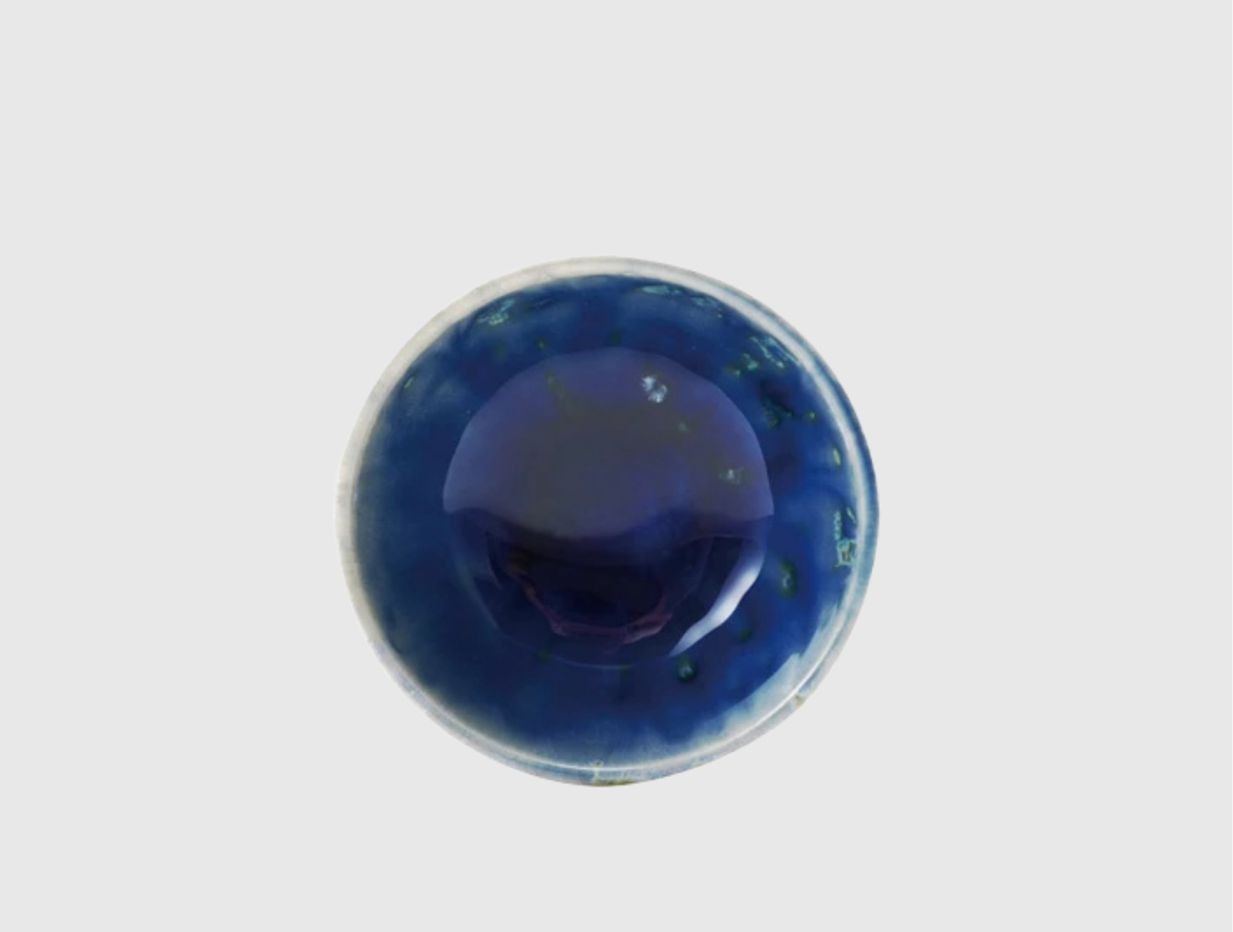 This stoneware dish features a reactive crackle glaze with a deep blue color. Due to the nature of the glazes process during firing, each piece will be unique.