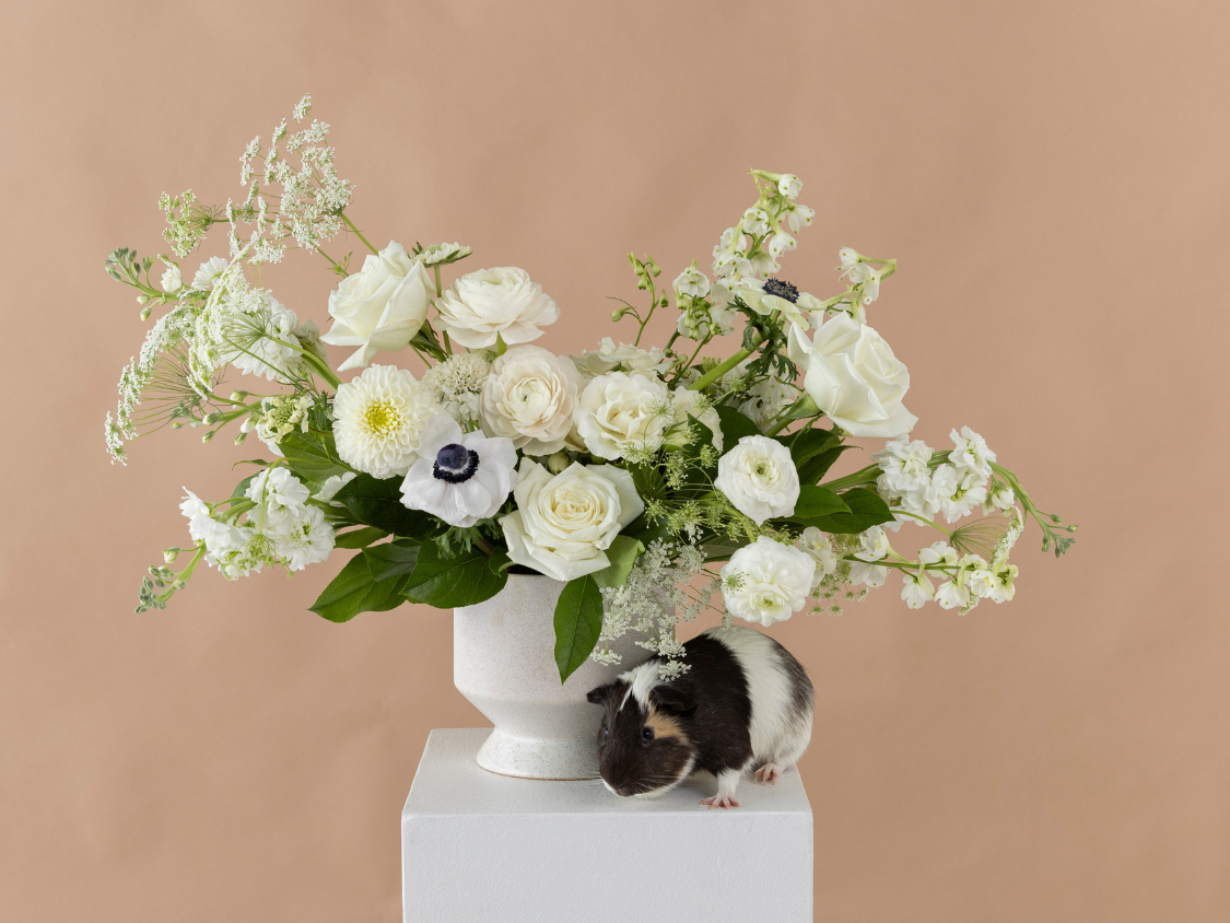 You might be able to tell who inspired creamy white arrangement, as he's known for his bold white spots and little black eyes, Mingus the guinea pig!