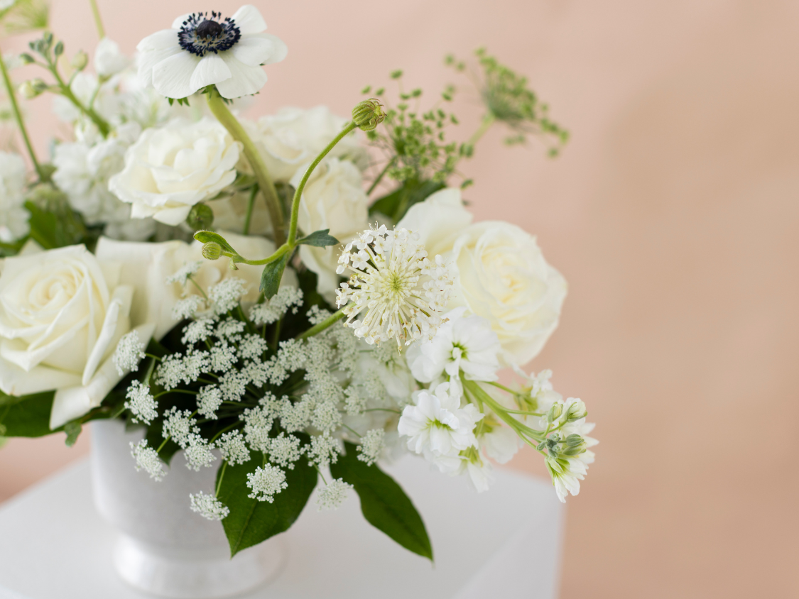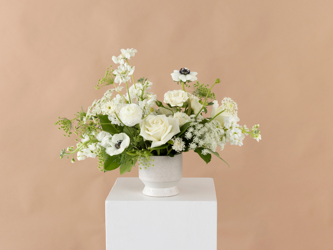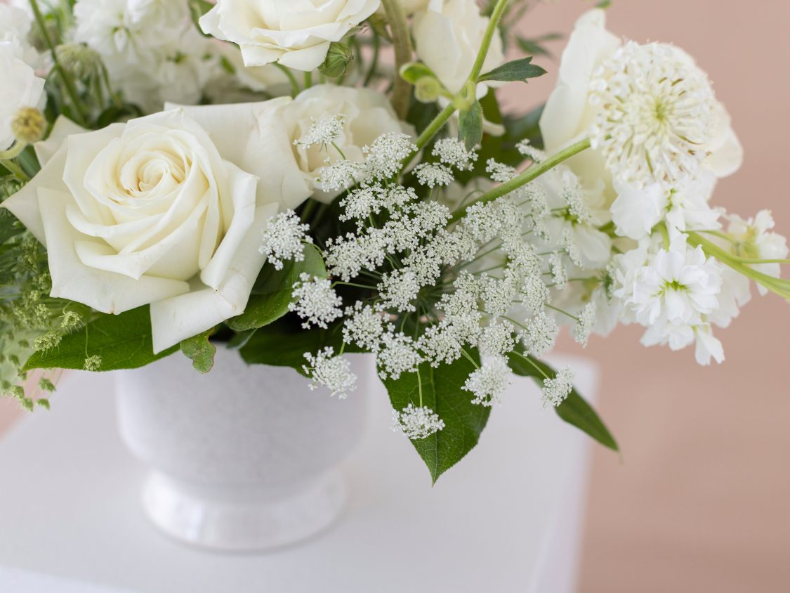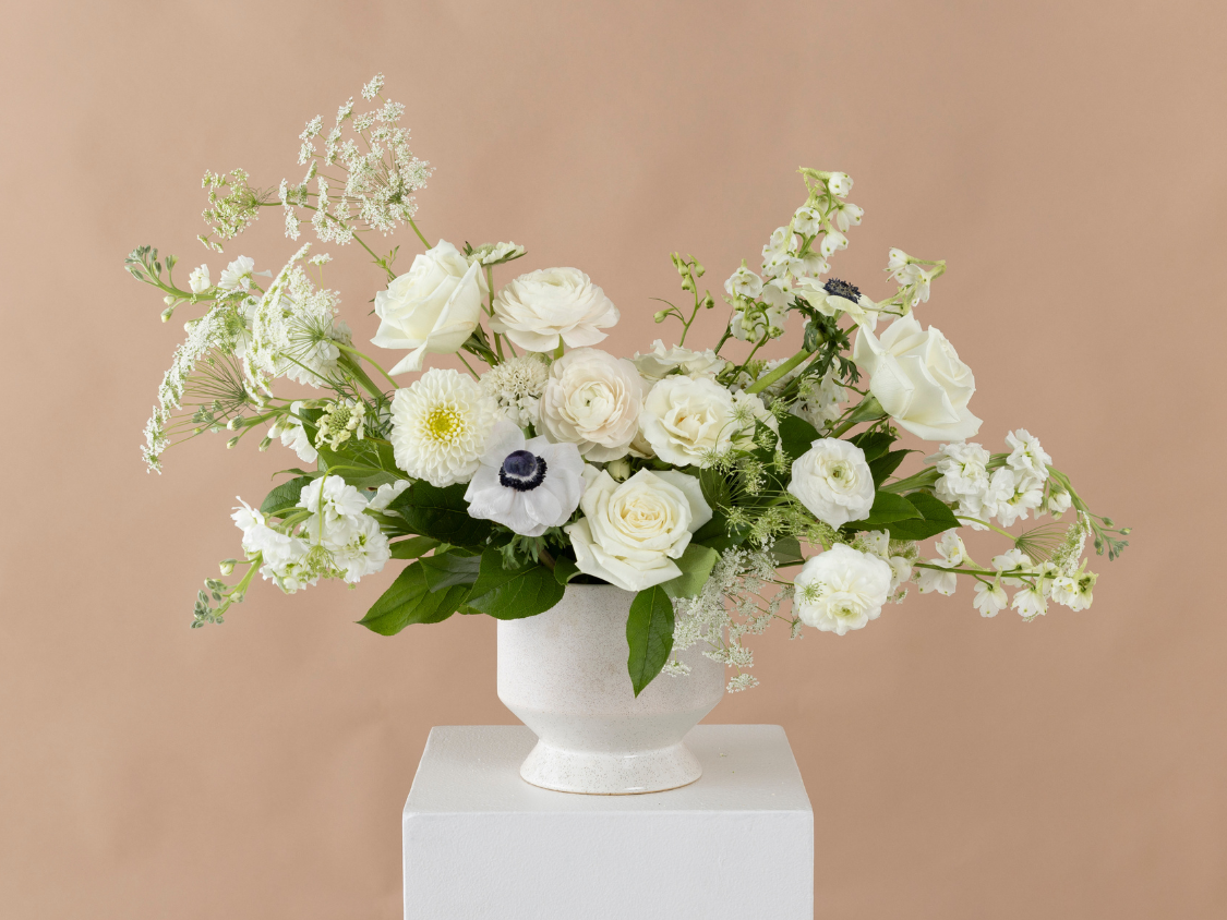 The floral arrangement features a blend of creams and whites with greens. This arrangement will include blooms like anemones, roses, dahlias, queen annes lace, and ranunculus.